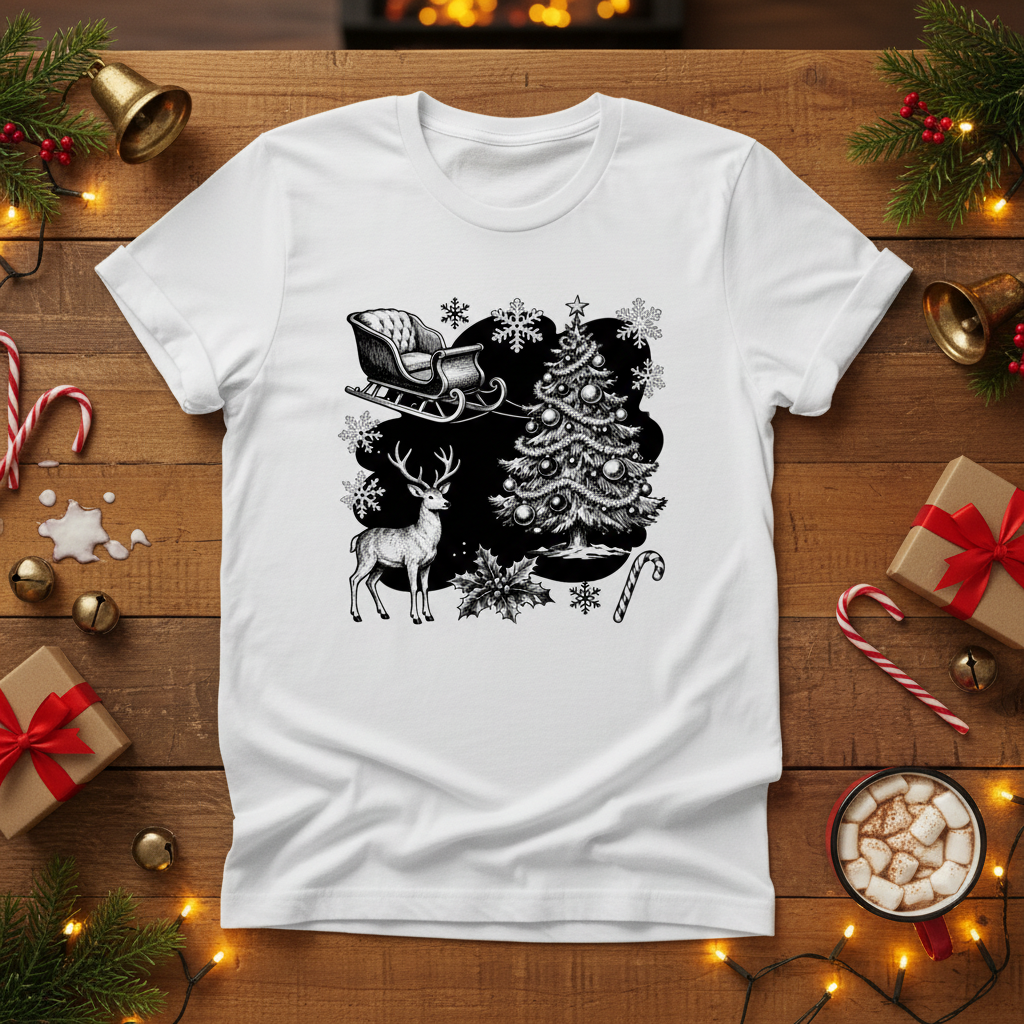 Bring timeless holiday charm to your everyday style with this Vintage Christmas Scene T-shirt. The detailed sketch-style artwork features a classic sleigh, reindeer, decorated tree, holly sprigs, snowflakes, and a soft black backdrop — giving the whole design a nostalgic, storybook Christmas feel.