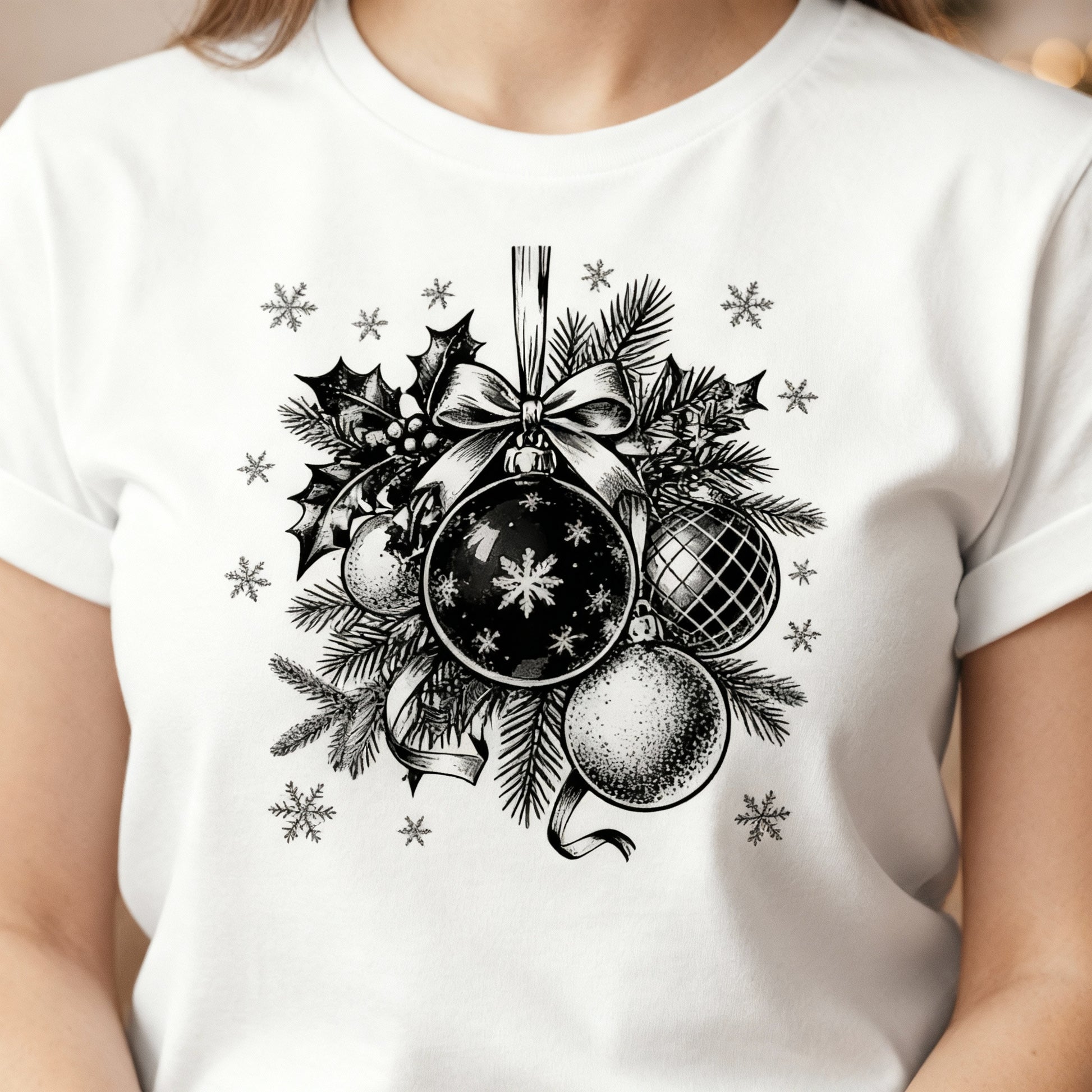 Add timeless holiday charm to your wardrobe with this Vintage Ornament Sketch tee. Featuring hand-drawn style ornaments, pine sprigs, holly, and delicate snowflakes, this design captures the soft, elegant feel of classic Christmas décor.