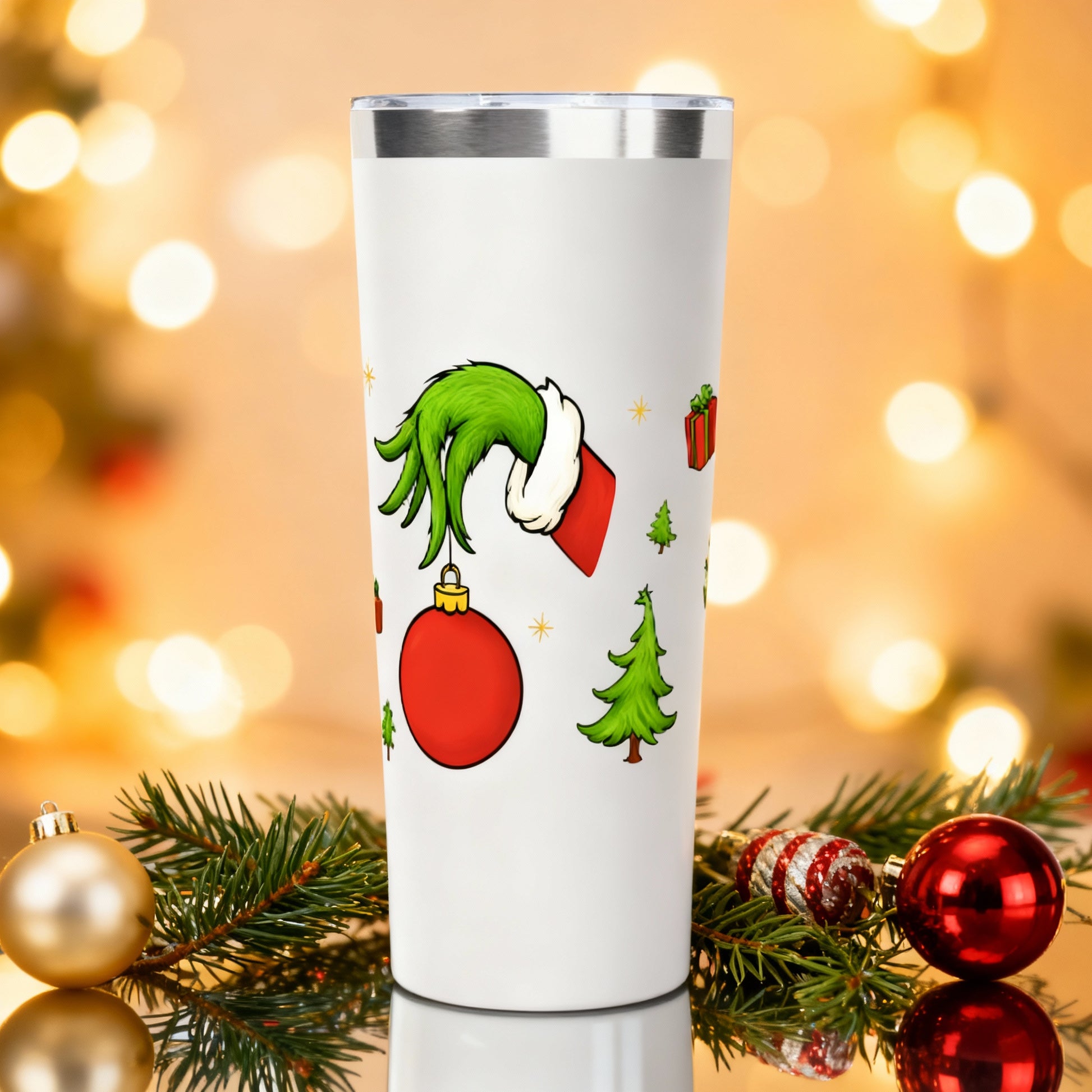 Bring a little sass to the season with the “That’s It, I’m Not Going” 22oz Stainless Steel Christmas Tumbler. With Grinch-inspired artwork featuring the iconic green hand, ornaments, and festive Christmas accents, this tumbler is the perfect holiday mood for anyone who loves a good laugh during the chaos of December.
