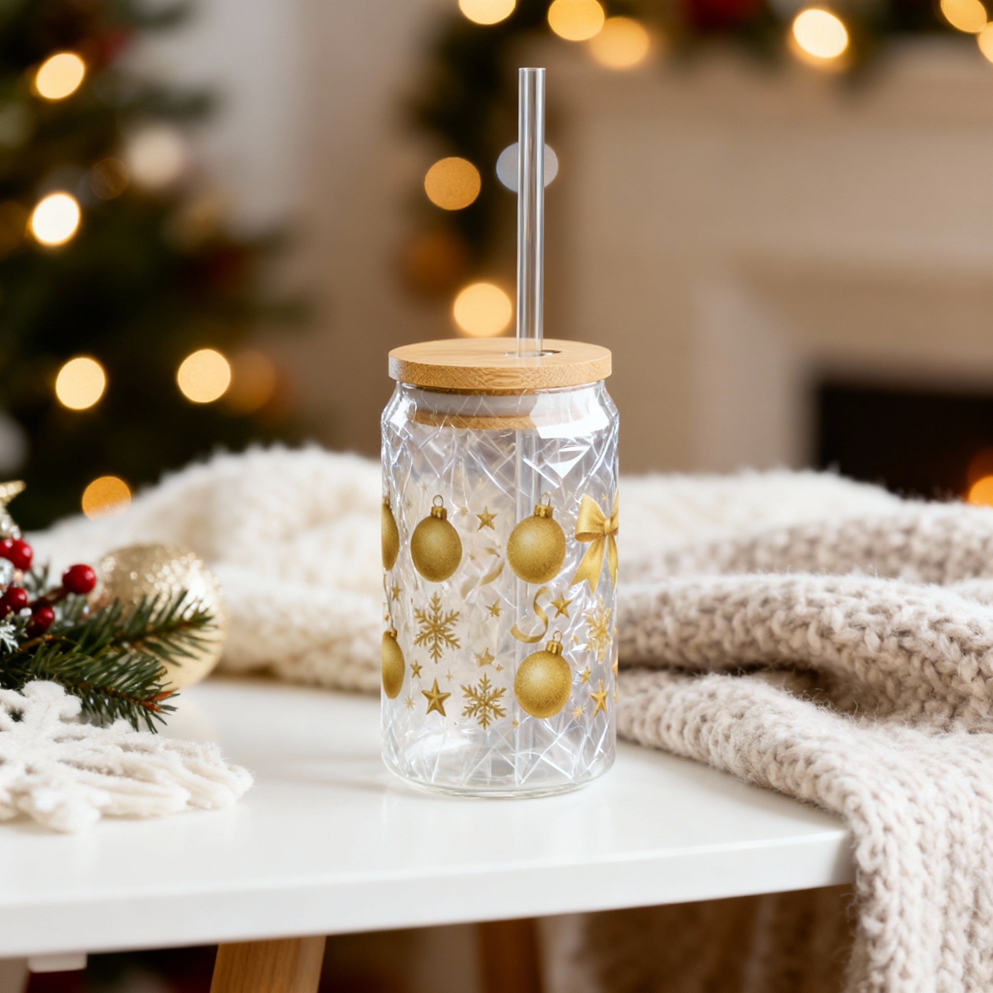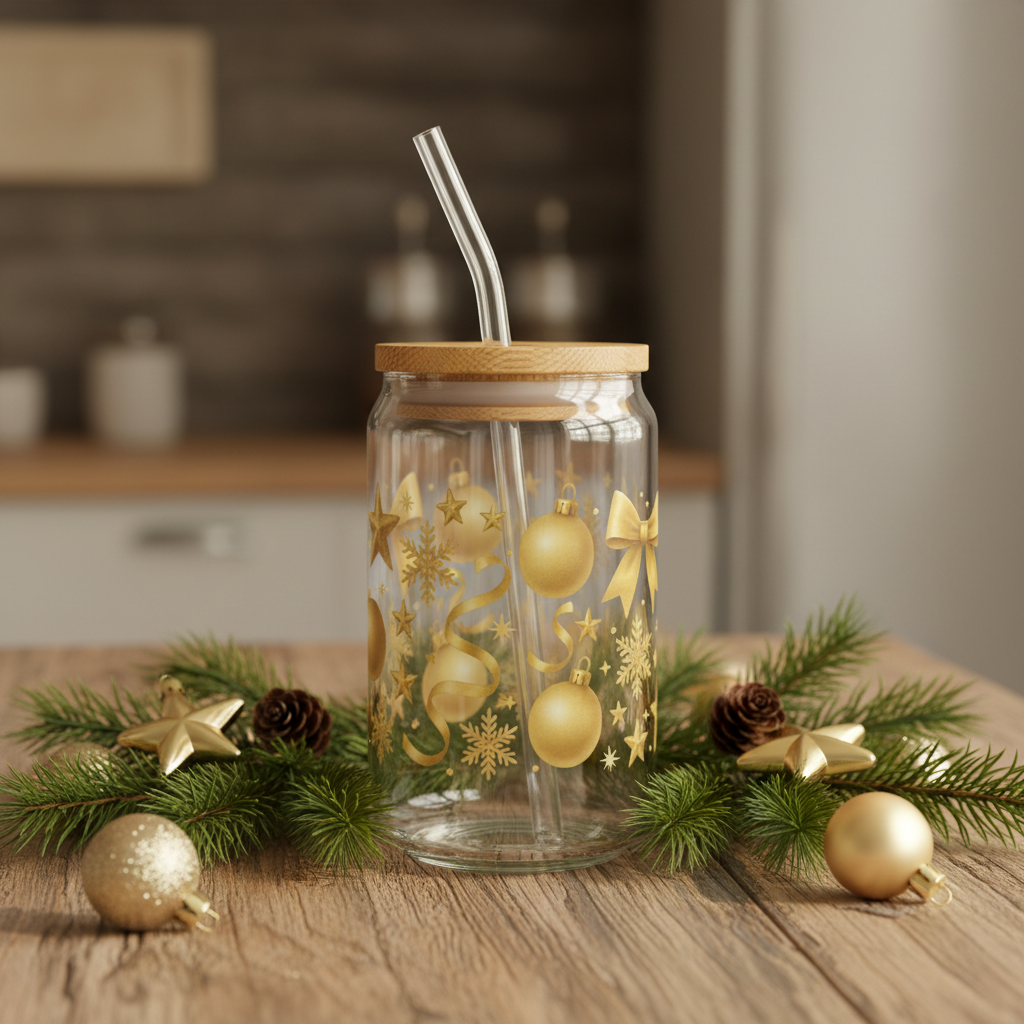 Sip in festive elegance with our 16oz Gold Ornaments Sipper Glass. Crafted from durable clear tempered glass, this cup is sleek, sturdy, and perfect for iced coffees, teas, cocktails, or any cozy holiday drink. Decorated with shimmering gold ornaments, stars, and ribbons, this glass adds that luxe Christmas glow to every sip.