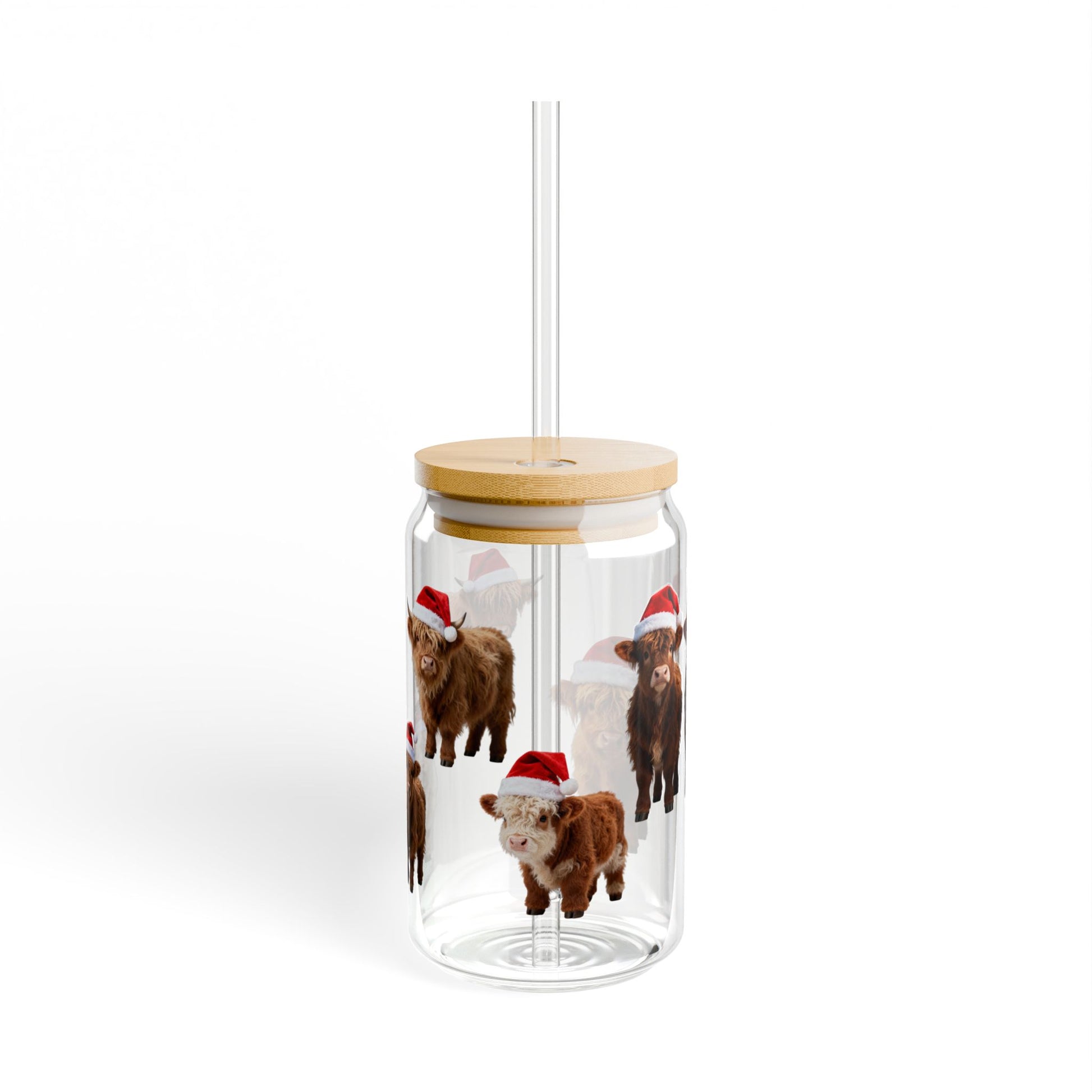 Quench your thirst in holiday style with our 16oz Highland Cow Christmas Sipper Glass. Made from durable clear tempered glass, this cup is sleek, sturdy, and perfect for iced coffees, juices, cocktails, or any festive beverage you love. The adorable Highland cows in Santa hats bring cozy farmhouse Christmas charm to every sip.
