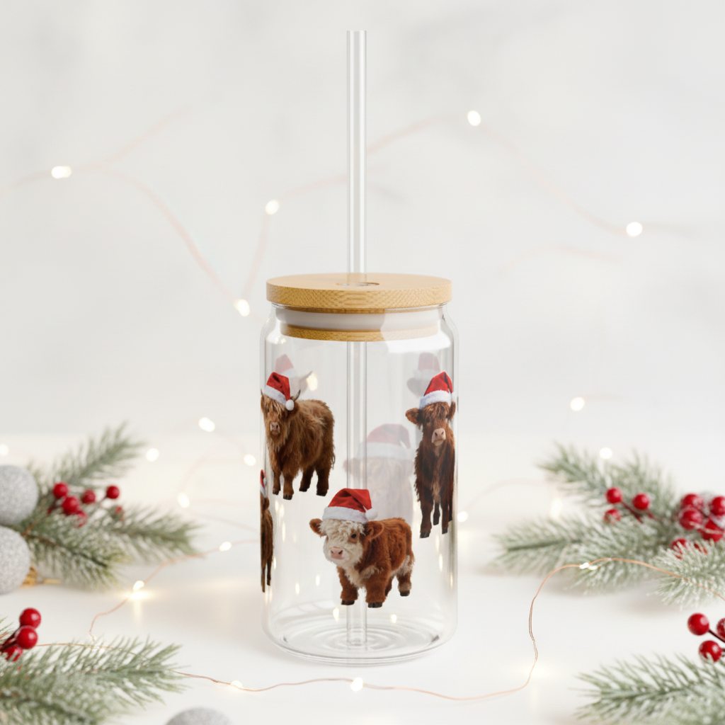 Highland Cow Christmas Glass Cup – 16oz Sipper with Bamboo Lid & Straw
