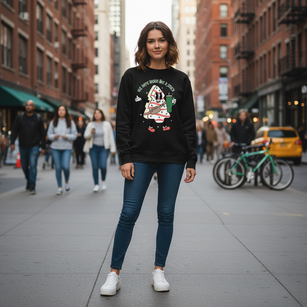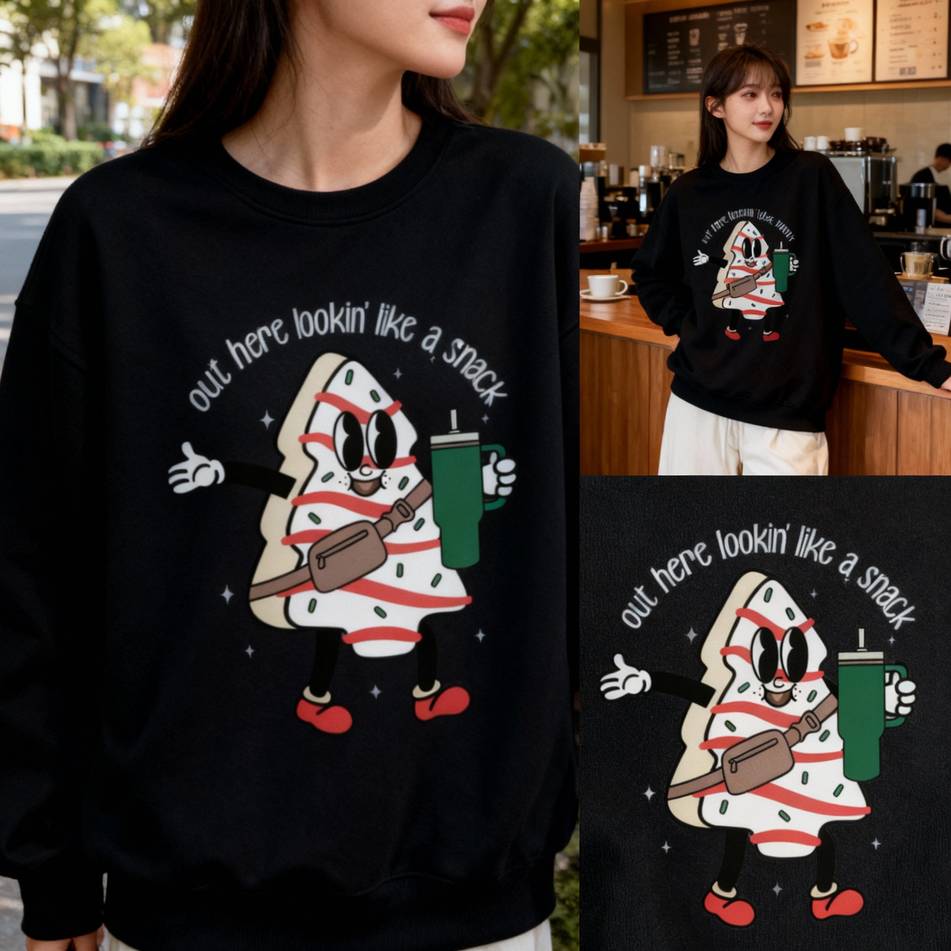 Bring some holiday humor to your wardrobe with this “Out Here Lookin’ Like a Snack” Christmas crewneck. Featuring a peppermint-striped cake character with a crossbody bag and tumbler, this design is playful, trendy, and perfect for anyone who loves Christmas treats with a side of attitude.