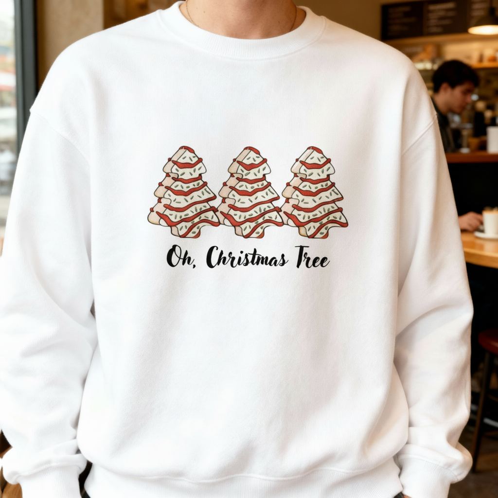 Add a playful twist to your holiday wardrobe with this Oh, Christmas Tree crewneck featuring three Little Debbie–style Christmas Tree Cakes lined up in the cutest festive row. Sweet, nostalgic, and super on-trend, this design is perfect for holiday parties, cookie swaps, family photos, and cozy nights in.