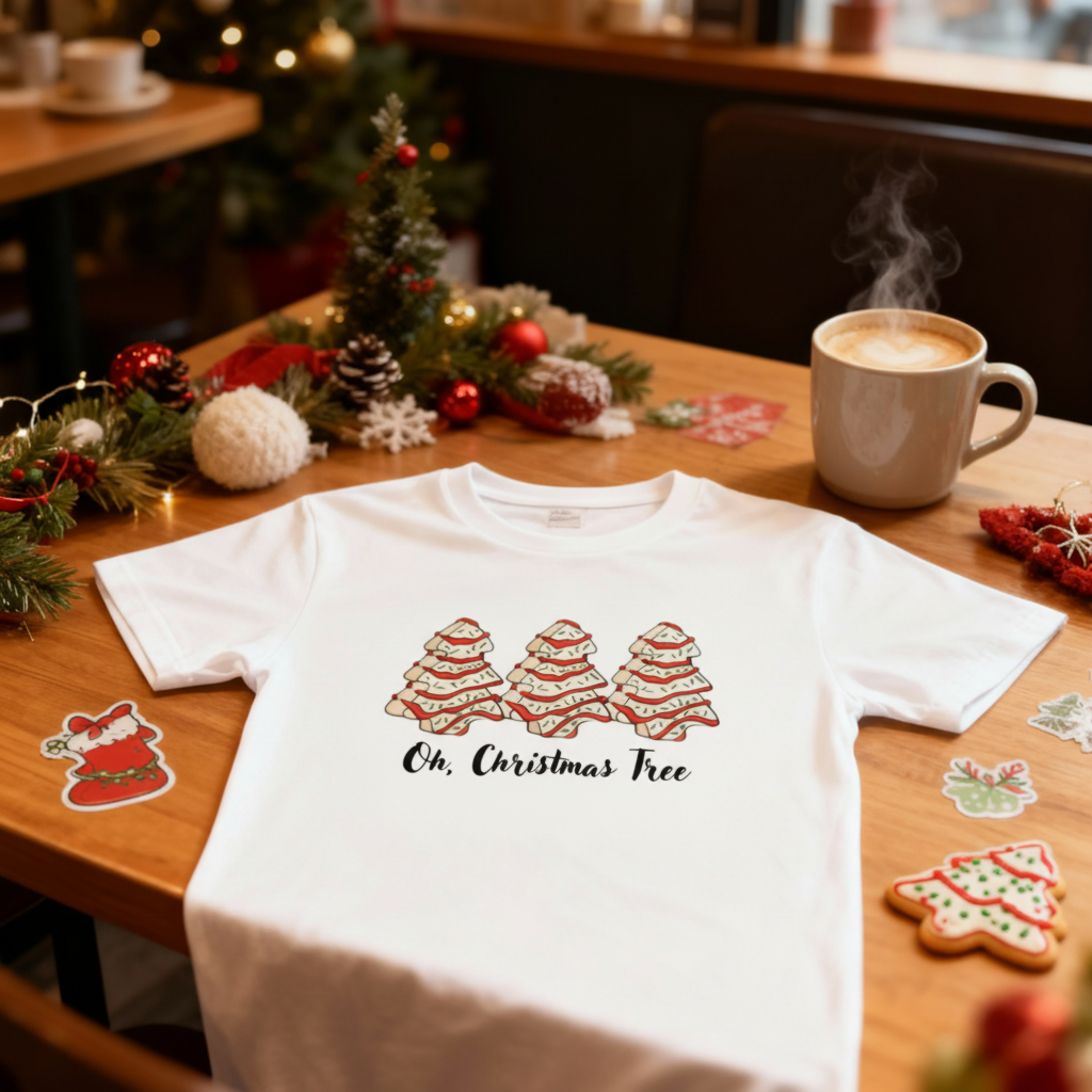 Bring sweet holiday nostalgia to your wardrobe with this adorable Oh, Christmas Tree tee. Featuring three Christmas Tree Cakes lined up in a festive row, this design is perfect for anyone who loves cozy holiday treats and classic Christmas vibes.
